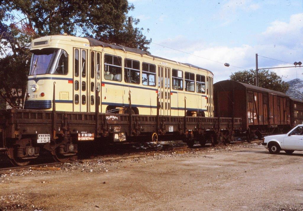 A Marseille, la motrice 2010 PCC La Brugeoise et Nivelles de la ligne 68 est photographiée sur un wagon plat à destination de la Belgique pour y être rénovée. Photo prise le mercredi 6 octobre 1982. Copyright : jean-pierre autié