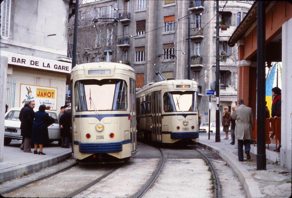 A Marseille, les motrices 2006 et 2001 PCC La Brugeoise et Nivelles sont photographiées à la station « Gare de la Blancarde », le dimanche 21 février 1982. La première circule en direction du terminus « Saint-Pierre » alors que la seconde opère en direction du terminus « Noailles » tous deux situés sur la ligne 68. Copyright : jean-pierre autié