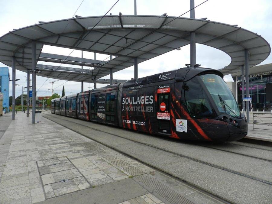 La livrée de l’exposition Soulages au musée Fabre à Montpellier joue les prolongations. Photographie de la rame 2099 Citadis 402 Alstom prise à la station « Place de France » de la ligne 1, le jeudi 30 avril 2020, 45e jour de confinement quasi généralisé pour cause de coronavirus Covid-19. Copyright : Anje34