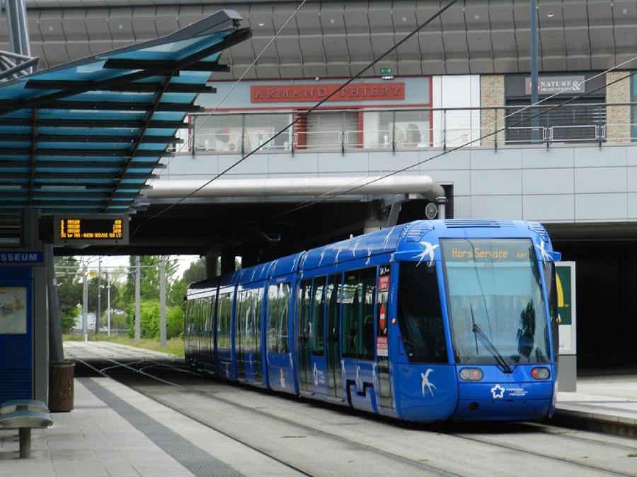 Un instant après être arrivée au terminus « Odysseum » de la ligne 1, la rame 2011 Citadis 401 Alstom va aller stationner quelques minutes sur une des deux voies en tiroir visibles sur la photo, le jeudi 30 avril 2020, 45e jour de confinement généralisé pour cause de pandémie de coronavirus Covid-19. Copyright : Anje34