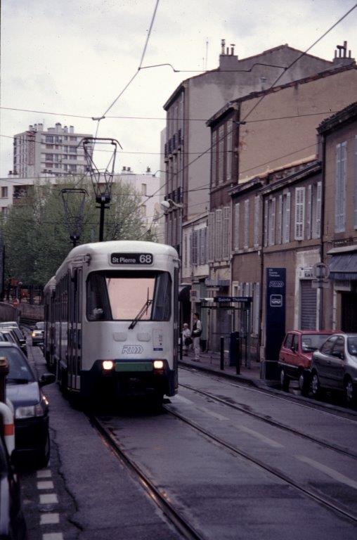 A Marseille, une doublette de motrices PCC La Brugeoise et Nivelles, opérant sur la ligne 68 en direction du terminus « Saint-Pierre », est photographiée à la hauteur de l’arrêt « Sainte-Thérèse », le dimanche 9 avril 2000. Copyright : Edouard Paris