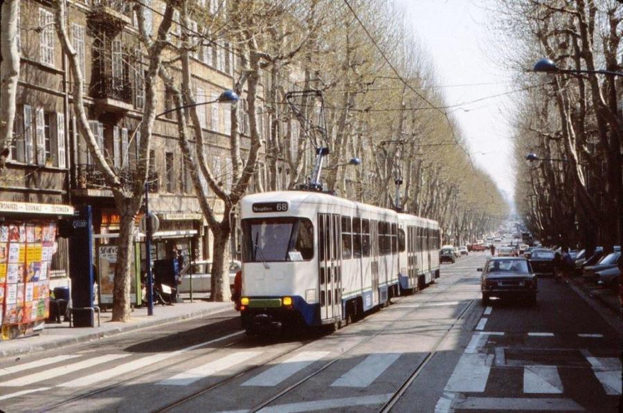 A Marseille, une doublette de motrice PCC La Brugeoise et Nivelles, opérant sur la ligne 68 en direction du terminus « Saint-Pierre », est photographiée sur le boulevard Chave, à la hauteur de l’arrêt « Jean Martin », le lundi 12 mars 1984. Copyright : jean-pierre autié