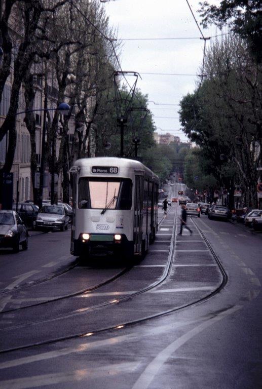 A Marseille, une doublette de motrices PCC La Brugeoise et Nivelles, opérant sur la ligne 68 en direction du terminus « Saint-Pierre », est photographiée à l’extrémité nord du boulevard Chave à l’approche de la station « Gare de la Blancarde », le dimanche 9 avril 2000. Copyright : Edouard Paris