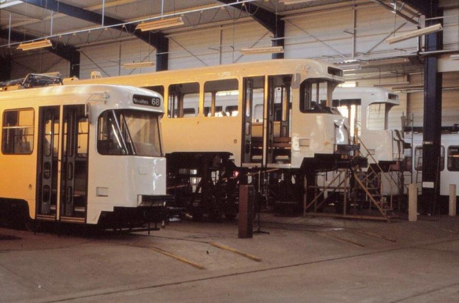 A Marseille, des motrices PCC La Brugeoise et Nivelles en cours de rénovation, afin d’être aptes à circuler en unité multiple, sont photographiées dans les ateliers du dépôt « Saint-Pierre », le samedi 19 novembre 1983. Copyright : jean-pierre autié