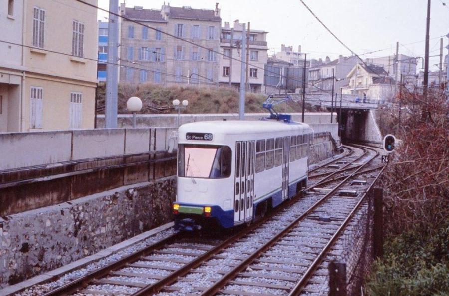A Marseille, une motrice PCC La Brugeoise et Nivelles rénovée, opérant sur la ligne 68 en direction du terminus « Saint-Pierre », est photographiée dans la tranchée Freyssinet entre la station « Gare de la Blancarde » et l’arrêt « Sainte-Thérèse, le mercredi 29 février 1984. Copyright : jean-pierre autié