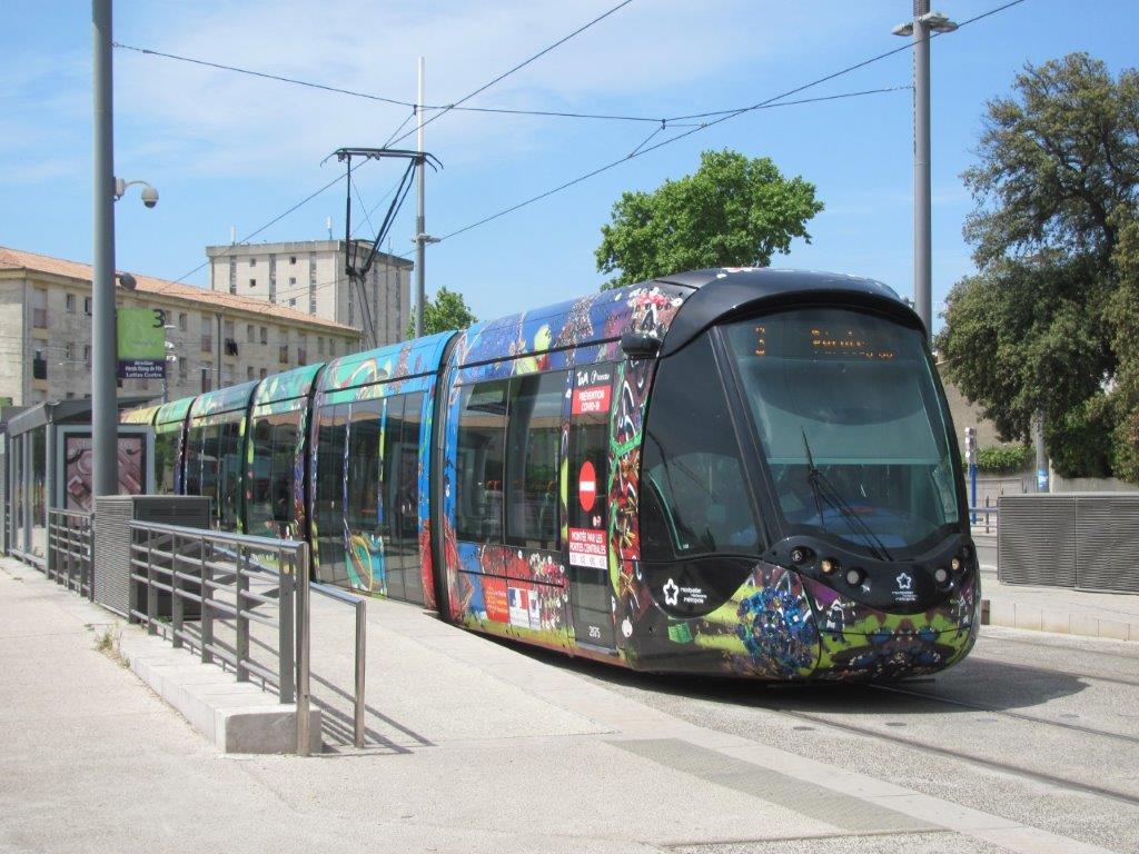 La rame 2075 Citadis 402 Alstom, opérant sur la ligne 3 en direction du terminus « Pérols – Etang de l’Or », est photographiée au moment où elle quitte la station « Tonnelles », le mardi 5 mai 2020, 50e jour de confinement quasi généralisé pour cause de pandémie de coronavirus Covid-19. Copyright : Edouard Paris