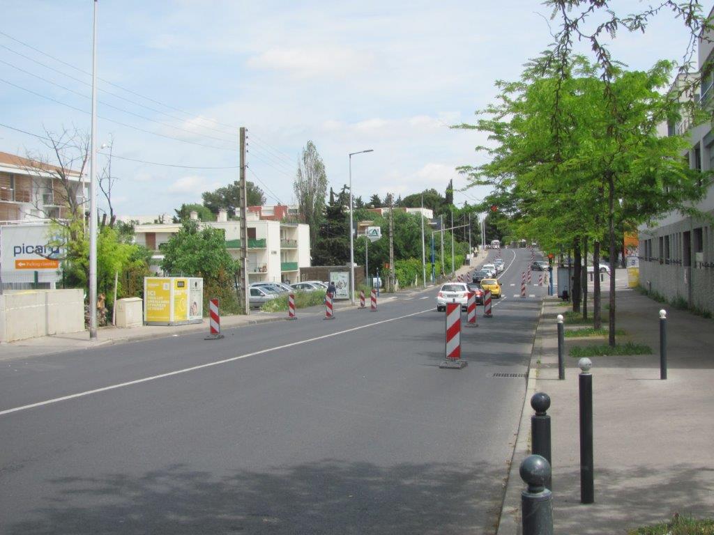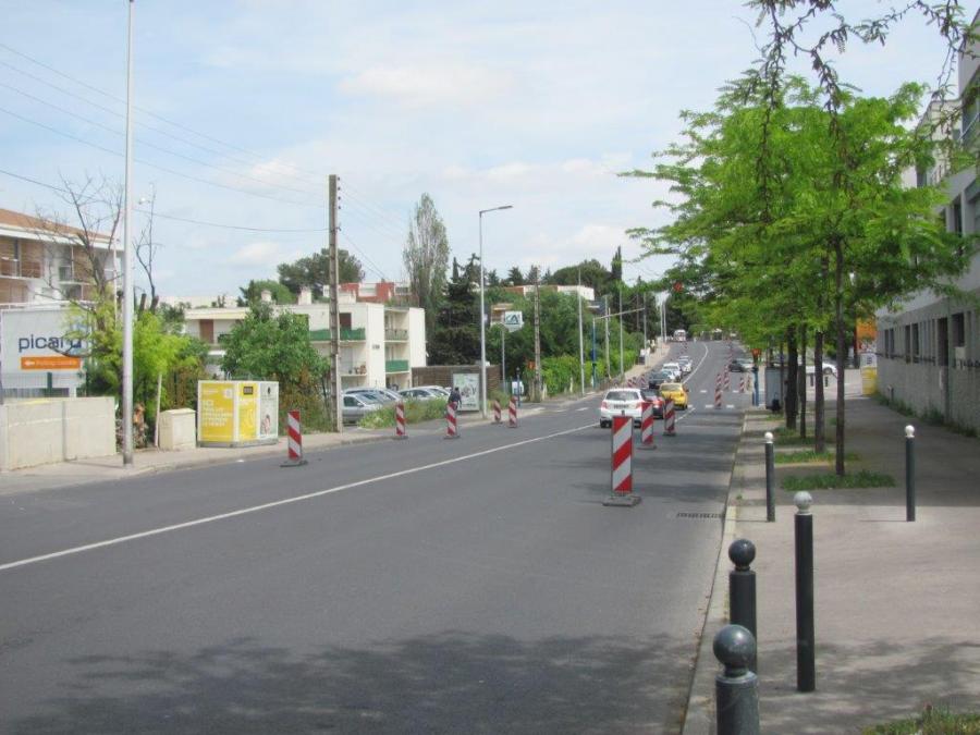 A Montpellier, vue sur les voies cyclables expérimentales temporaires de chaque côté de la rue Paul-Rimbaud à proximité de l’arrêt « Jean Calvin » de la ligne 15 de bus urbain, le mardi 5 mai 2020. Copyright : Edouard Paris