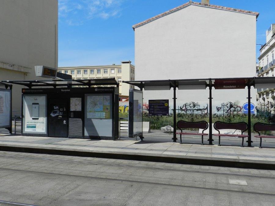Affiche autocollante « Prévention Covid-19 – Port du masque obligatoire » visible sur une paroi vitrée d’un abri de la station « Rondelet » commune aux lignes 2 et 4, le jeudi 7 mai 2020. Copyright : Anje34