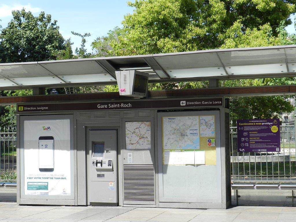 Affiche autocollante « Prévention Covid-19 – Port du masque obligatoire » visible sur une paroi vitrée d’un abri de la station « Gare Saint-Roch » commune aux lignes 3 et 4, le jeudi 7 mai 2020. Copyright : Anje34