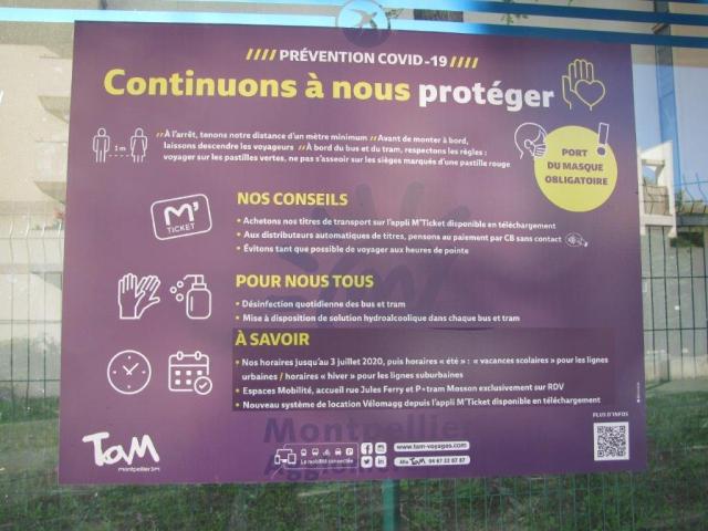 Mieux vaut tard que jamais. Au 52e jour de confinement quasi généralisé sur le territoire national pour cause de pandémie de coronavirus Covid-19, TaM Montpellier 3M vient enfin de prendre l’initiative d’appliquer des affiches autocollantes « Prévention Covid-19 » aux arrêts de bus dotés d’un abri et dans les 84 stations de son réseau de tramways.