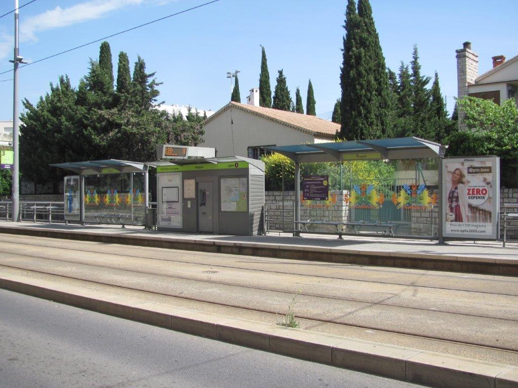 A la station « Pergola » de la ligne 3, quai direction « Juvignac », on distingue l’affiche autocollante « Prévention Covid-19 – Port du masque obligatoire » appliquée sur la paroi vitrée d’un des abris, le vendredi 8 mai 2020. Copyright : Edouard Paris