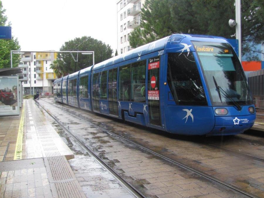 La rame 2027 Citadis 401 Alstom, opérant sur la ligne 1 en direction du terminus « Odysseum », est photographiée à la station « Saint-Eloi » où des marquages au sol de distanciation sociale ont été appliqués sur les quais, à l’instar d’autres stations très fréquentées du réseau de tramways montpelliérain, le lundi 11 mai 2020, premier jour de déconfinement progressif. Copyright : Edouard Paris