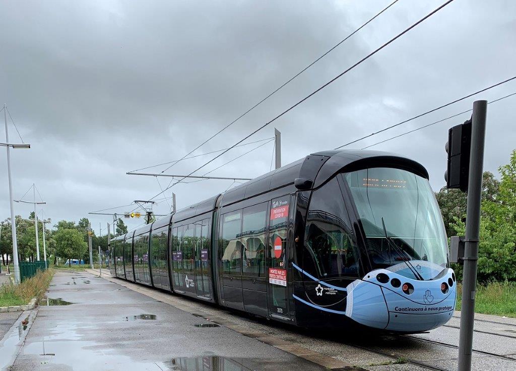 Photographie de la rame 2070 Citadis 402 Alstom, dont le nez de chaque motrice est affublé d’un masque chirurgical, sur une des deux voies en tiroir du terminus « Odysseum » de la ligne 1, le lundi 11 mai 2020 à 17h30, premier jour de déconfinement progressif. Copyright : Max