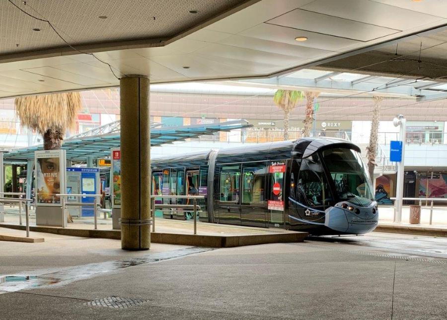 Photographie de la rame 2070 Citadis 402 Alstom, dont le nez de chaque motrice est affublé d’un masque chirurgical, au terminus « Odysseum » de la ligne 1 quelques instants avant son départ pour le terminus « Mosson », le lundi 11 mai 2020 à 17h35, premier jour de déconfinement progressif. Copyright : Max