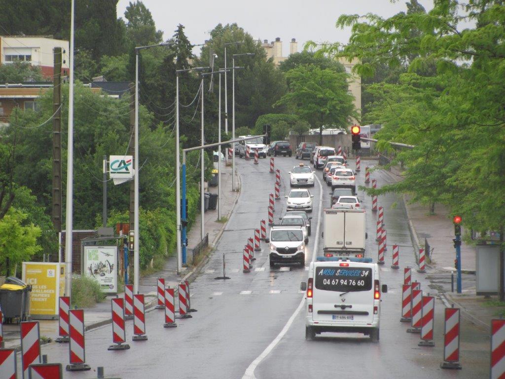 Les voies cyclables expérimentales temporaires ont colonisé chaque voie de droite de la rue Paul-Rimbaud à Montpellier à 2 x 2 voies. Photo prise le lundi 11 mai 2020 à 10h34, premier jour de déconfinement progressif. Copyright : Edouard Paris