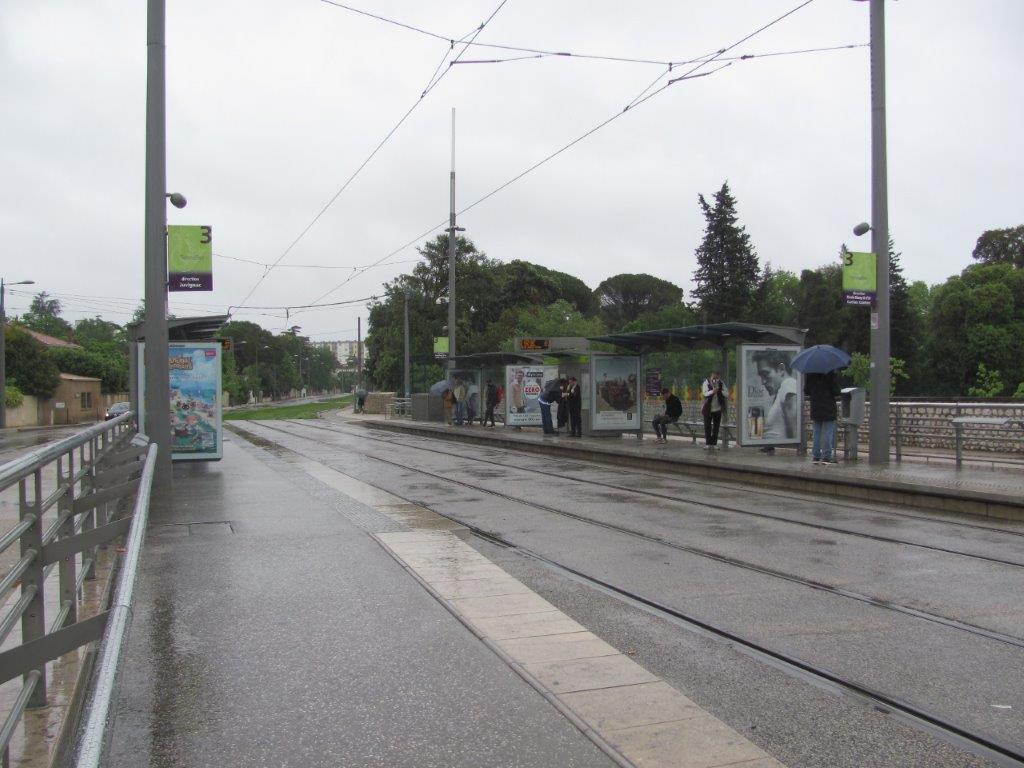 Photographie de la station « Tonnelles » de la ligne 3, où la plupart des quelques personnes qui attendent le tramway portent un masque, le lundi 11 mai 2020 à 10h18, premier jour de déconfinement progressif. Copyright : Edouard Paris
