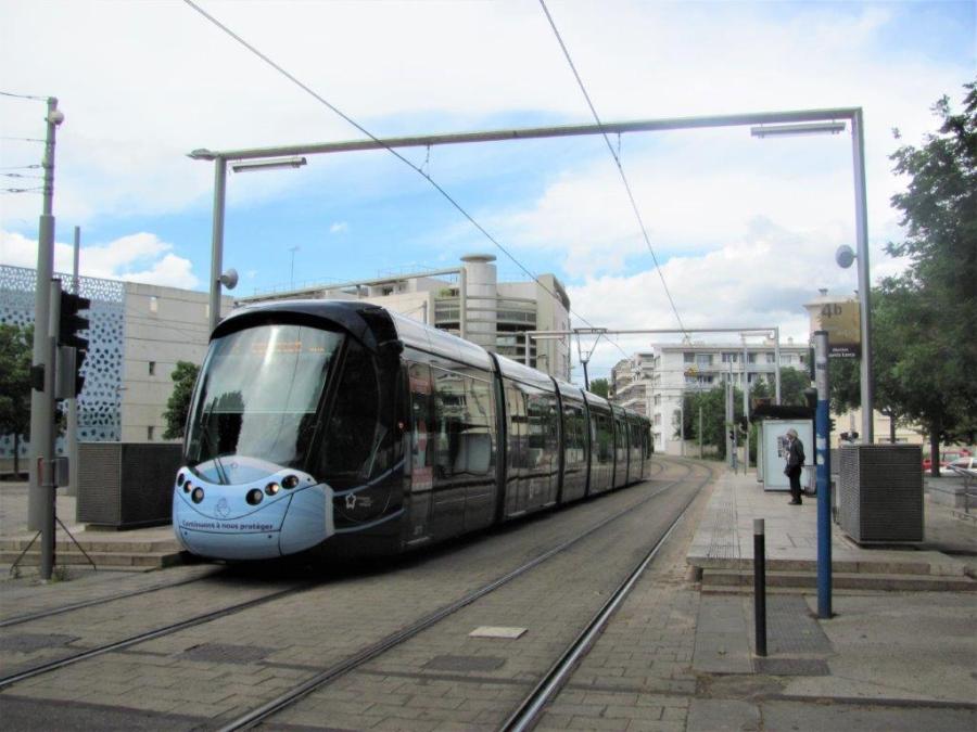 La rame 2070 Citadis 402 Alstom, opérant sur la ligne 1 en direction du terminus « Odysseum » et dont le nez de chaque motrice est affublé d’un masque chirurgical, est photographiée à la station « Rives du Lez » commune aux lignes 1 et 4, le mardi 12 mai 2020. Copyright : Edouard Paris