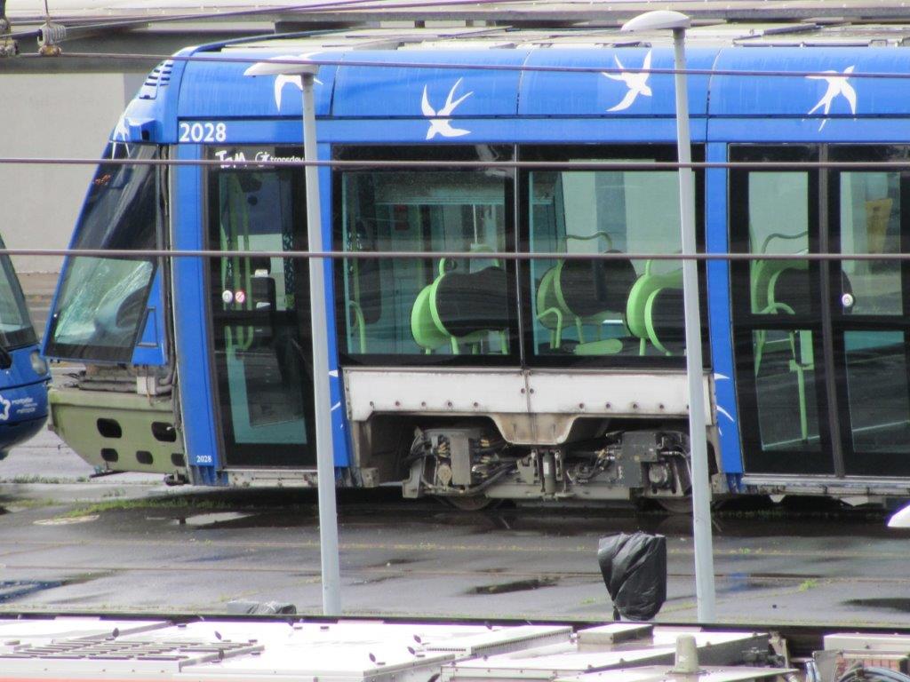 Sur le remisage extérieur du centre d’exploitation et de maintenance « Les Hirondelles », quartier Mosson à Montpellier, gros plan sur la motrice de la rame 2028 Citadis 401 Alstom accidentée le lundi 2 décembre 2019. Photo prise le lundi 11 mai 2020. Copyright : Edouard Paris