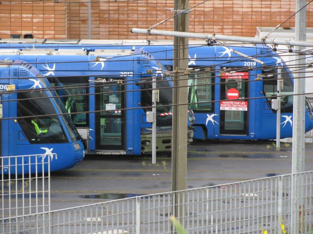 Sur le remisage extérieur du centre d’exploitation et de maintenance « Les Hirondelles », quartier Mosson à Montpellier, la porte à un vantail de la motrice de la rame 2012 Citadis 401 Alstom, accidentée le lundi 2 décembre 2019, ne porte pas la signalétique « Prévention Covid-19 ». Photo prise le lundi 11 mai 2020. Copyright : Edouard Paris