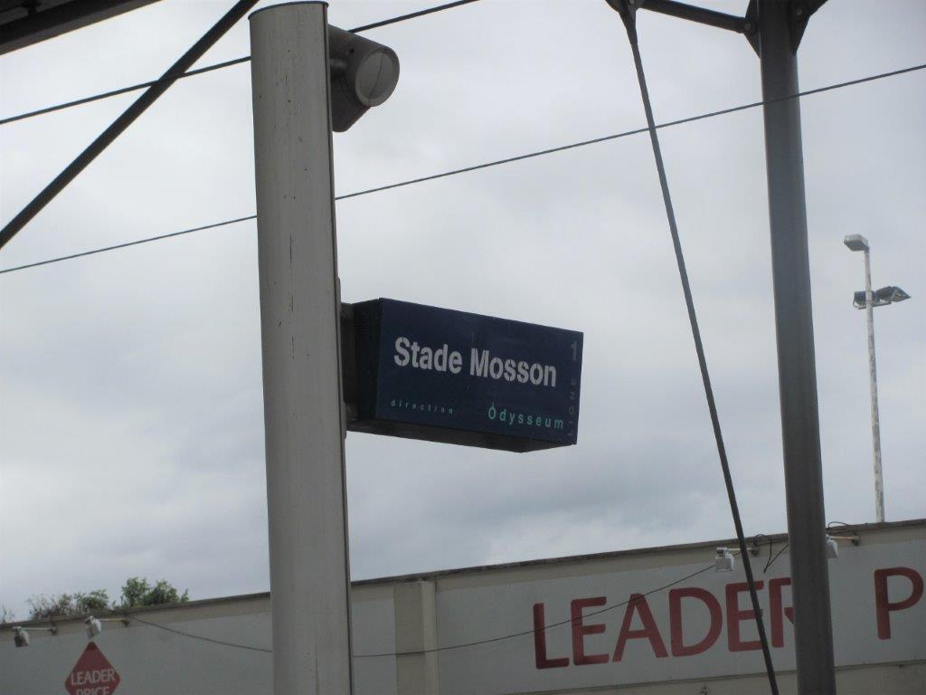 Dos du caisson du tableau électronique d’information fixé à un mât de soutien du vaste auvent de la station « Stade de la Mosson » de la ligne 1, quai direction « Odysseum » sur lequel il est inscrit « Stade Mosson ». Photo prise le mercredi 13 mai 2020. Copyright : Edouard Paris