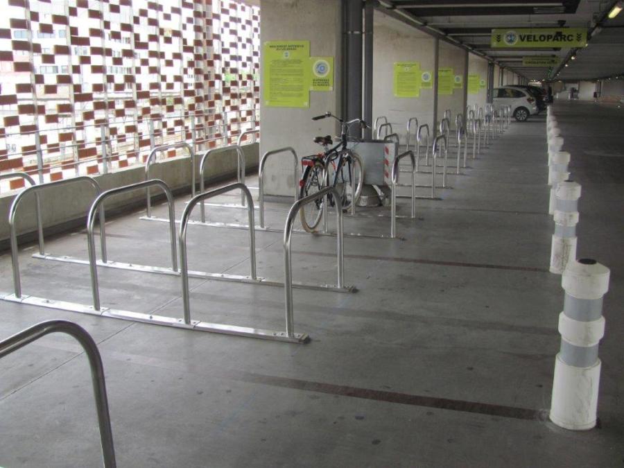 Dans le parking Saint-Roch à Montpellier, des arceaux de sécurité pour les vélos ont été installés sur des places du niveau P2 courte durée. Photo prise le jeudi 14 mai 2020 à 14h30 où on ne comptait qu’un seul vélo. Copyright : Edouard Paris