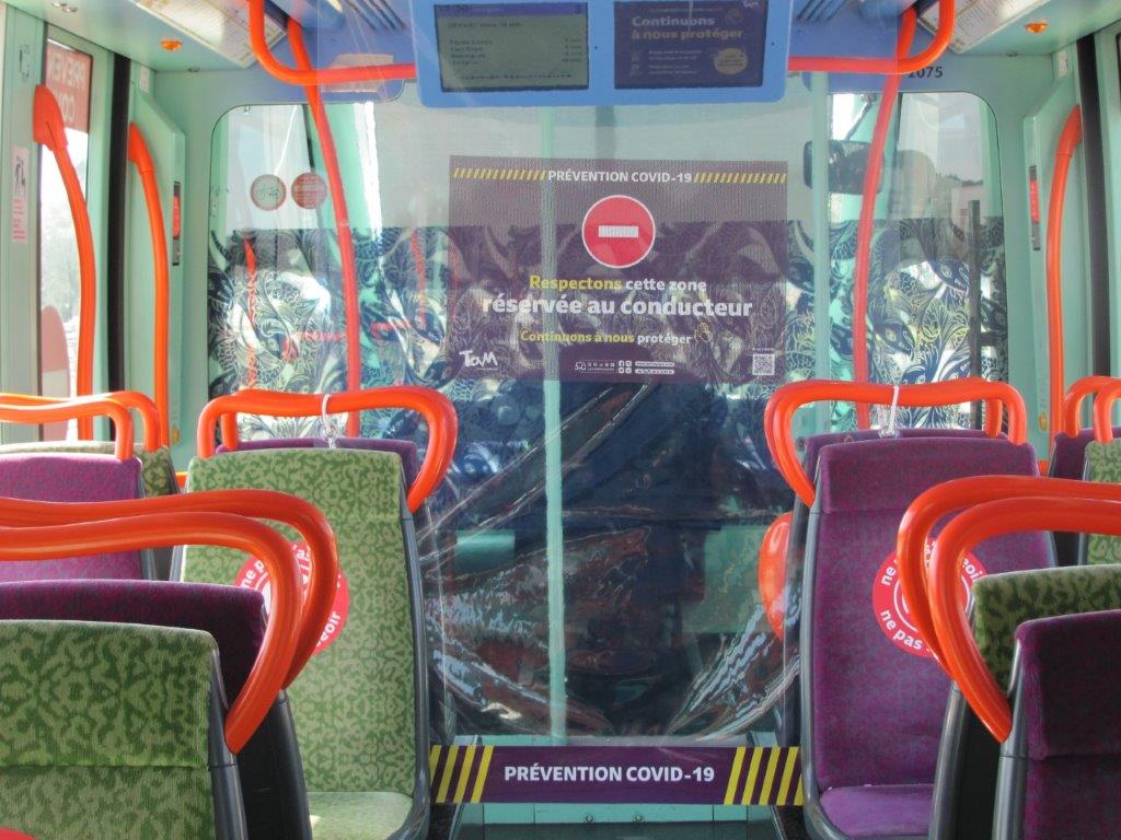 Cloison séparative plastifiée entre le compartiment voyageurs et la plateforme donnant accès à la cabine de conduite dans une motrice de la rame 2075 Citadis 402 Alstom opérant sur la ligne 3, le dimanche 17 mai 2020, 7e jour de déconfinement progressif en lien avec la pandémie de coronavirus Covid-19. Copyright : Edouard Paris