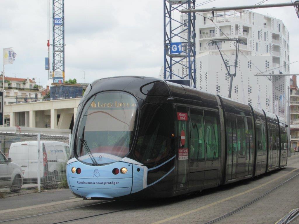 La rame 2049 Citadis 302 Alstom multiligne, opérant sur la ligne 4 dans le sens b et dont le nez de chaque motrice est couvert par un masque chirurgical, est photographiée rue Alexandra David-Néel à Montpellier, le jeudi 14 mai 2020, 4e jour de déconfinement progressif en lien avec la pandémie de coronarivus Covid-19. Copyright : Edouard Paris