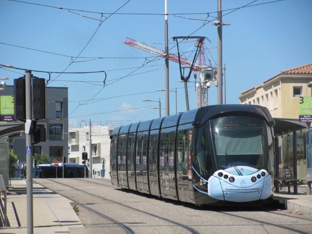 La rame 2070 Citadis 402 Alstom, opérant sur la ligne 3 en direction du terminus « Lattes Centre » et dont le nez de chaque motrice arbore la reproduction d’un masque chirurgical, est photographiée à la station « Celleneuve », le mercredi 20 mai 2020, 10e jour de déconfinement progressif en lien avec la pandémie de coronavirus Covid-19. Copyright : Edouard Paris