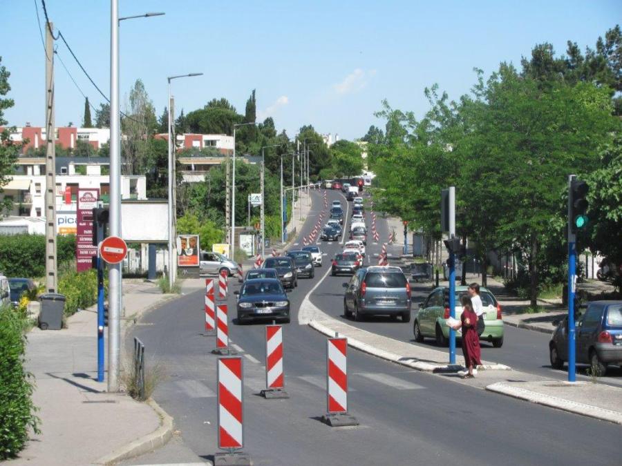 Circulation difficile dans chaque sens rue Paul-Rimbaud à Montpellier où des voies cyclables expérimentales temporaires ont été ouvertes sur chaque voie de droite, le lundi 4 mai 2020. Photo prise à 15h35, le mercredi 20 mai 2020, 10e jour de déconfinement progressif en lien avec la pandémie de coronavirus Covid-19. Copyright : Edouard Paris