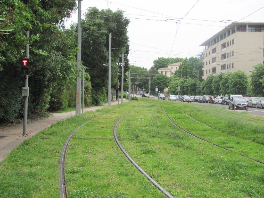 Au centre gauche de la photo prise le samedi 23 mai 2020, la voie en tiroir de l’avenue Saint-Charles parallèle aux voies 2 et 1 de la ligne 1. En arrière plan, la station « Place Albert 1er – Saint-Charles » de la ligne 1. Copyright : Edouard Paris