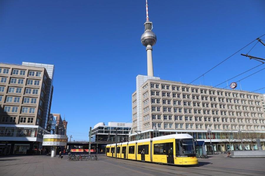 A Berlin, la rame 9057 F8Z11 Bombardier bidirectionnelle, opérant sur la ligne M4 en direction du terminus « S Hackescher Markt », est photographiée sur Alexanderplatz, le dimanche 19 avril 2020, un jour de mesures restrictives pour cause de pandémie de coronavirus Covid-19. Copyright : Urban Transport Magazine