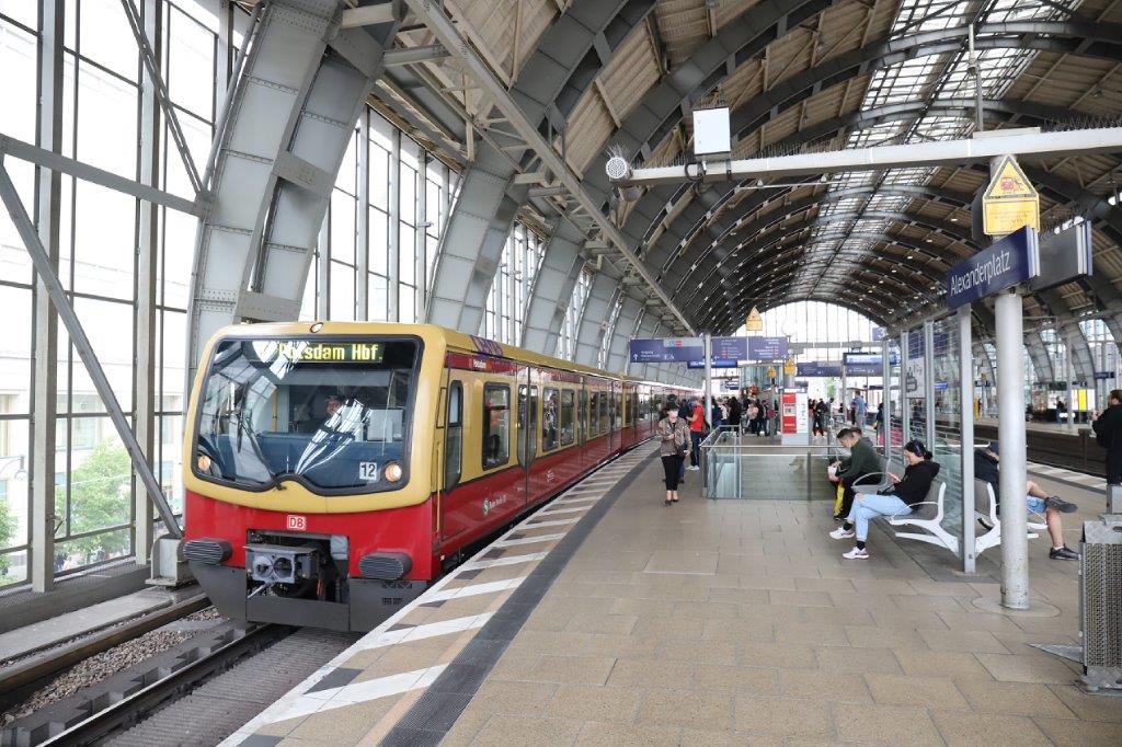 Une unité multiple de rames S-Bahn, opérant sur la ligne S7 en direction de Potsdam Hbf, est photographiée en gare de Berlin Alexanderplatz, le samedi 23 mai 2020, un jour de mesures assouplies en lien avec la pandémie de coronavirus Covid-19. Copyright : Urban Transport Magazine