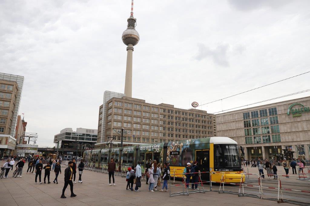 A Berlin, la rame 9007 F8Z11 Bombardier bidirectionnelle à la livrée intégrale Kernkraft, opérant sur la ligne M4 en direction du terminus « Falkenberg », est photographiée sur Alexanderplatz, le samedi 23 mai 2020. A noter la présence de barrières de sécurité de chaque côté des voies du tramway dans le but d’empêcher l’interruption du trafic par les manifestants « anti-restriction de liberté » pour cause de pandémie de coronavirus Covid 19 qui devaient se rassembler sur ladite place le même jour. Copyright : Urban Transport Magazine