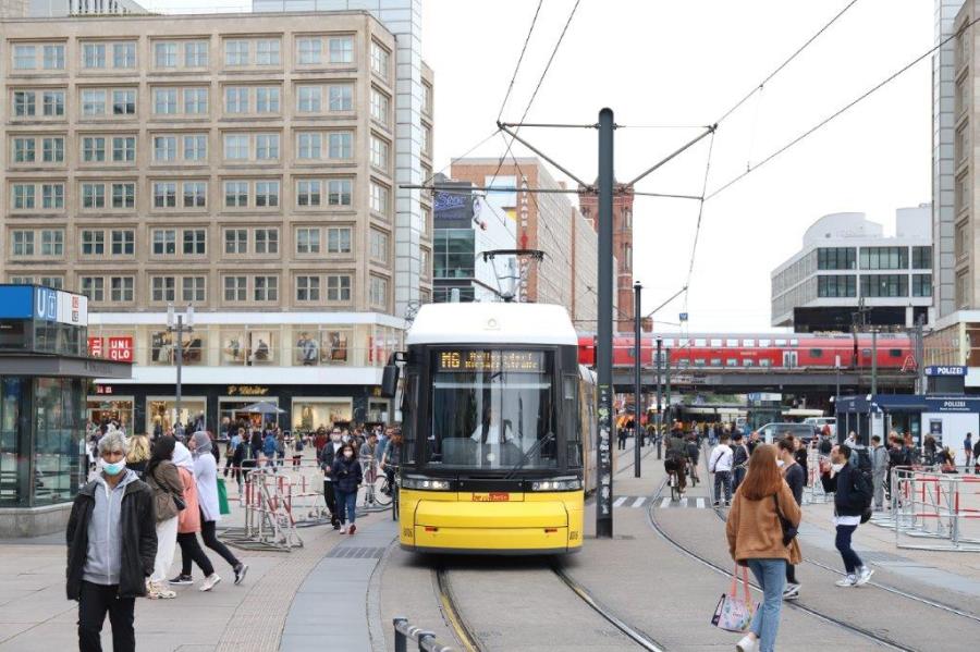 A Berlin, la rame 8006 F8E11 Bombardier unidirectionnelle, opérant sur la ligne M6 en direction du terminus « Hellersdorf Riesaer Strasse », est photographiée à l’approche de la station « U-Bahnhof Alexanderplatz » commune aux lignes M4, M5 et M6, le samedi 23 mai 2020, un jour de mesures assouplies en lien avec la pandémie de coronavirus Covid-19. Copyright : Urban Transport Magazine