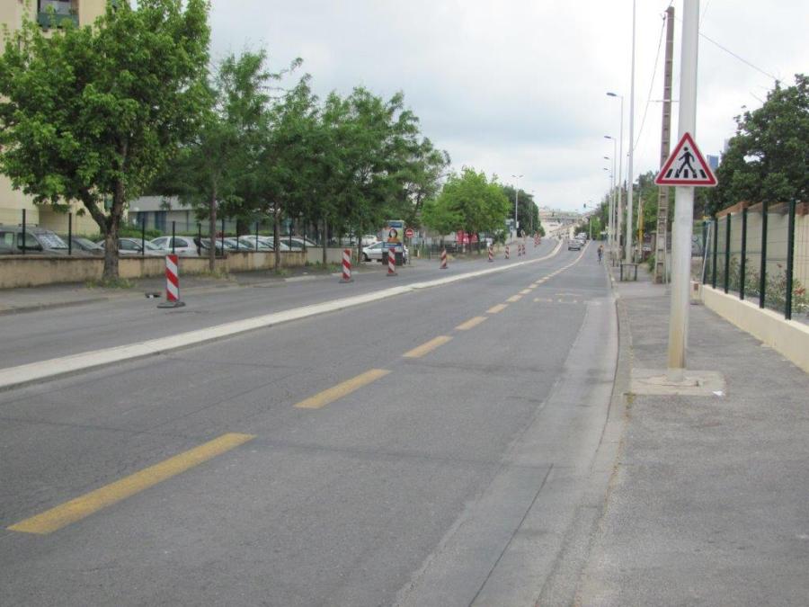 Aperçu de la voie mixte bus-vélo de l’avenue de la Justice-de-Castelnau, entre l’avenue du Major Flandre et la route de Mende. A gauche sur la photo, il n’existe que la voie cyclable expérimentale temporaire, les bus de la ligne 15 devant utiliser la voie conservée pour la circulation générale. Photo prise le dimanche 31 mai 2020. Copyright : Edouard Paris