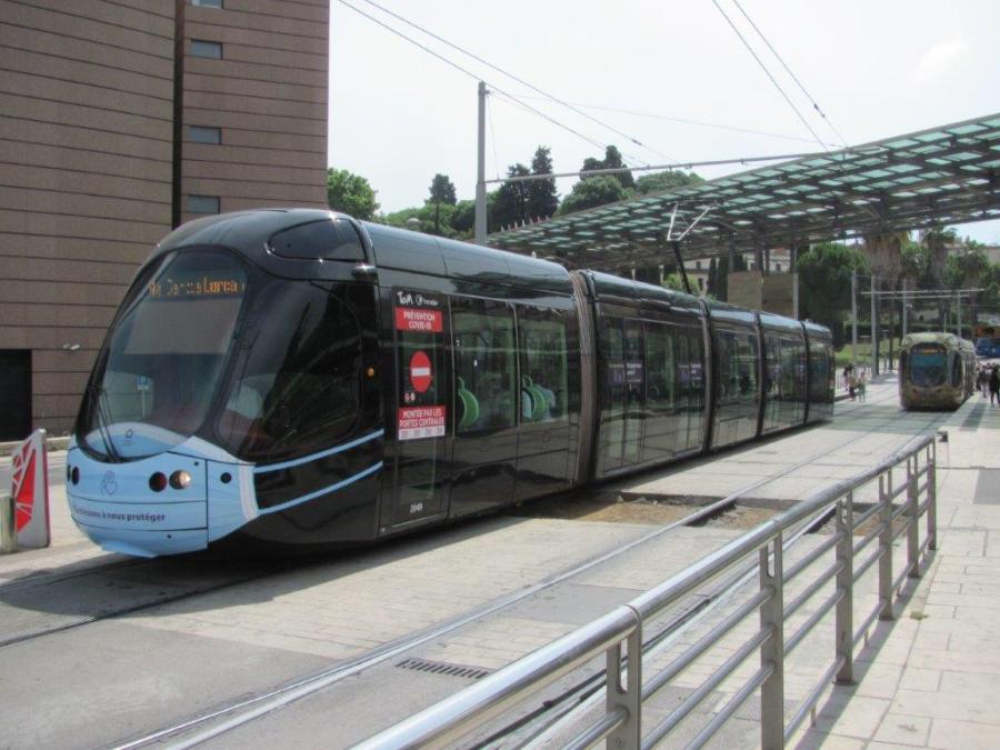 Aucun numéro de rame appliqué au-dessus des portes à un vantail de chaque motrice de la rame 2049 Citadis 302 Alstom multiligne photographiée à la station « Corum », alors qu’elle circule sur la ligne 4 dans le sens a, le mercredi 3 juin 2020. Copyright : Edouard Paris