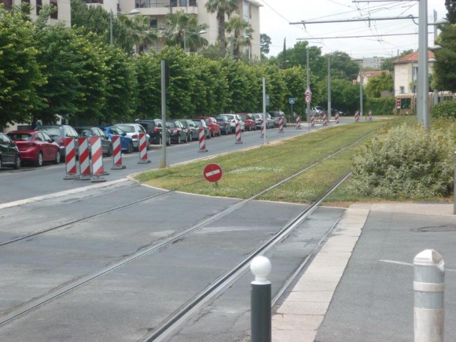 Sur la gauche de la photo, aperçu de la première partie de l’avenue Saint-Charles à Montpellier sur laquelle une voie cyclable expérimentale temporaire a été aménagée sur la voie de droite et où il existe une zone de stationnement sur voirie située à gauche de la seule voie désormais réservée à la circulation générale. Photo prise le jeudi 4 juin 2020. Copyright : Edouard Paris