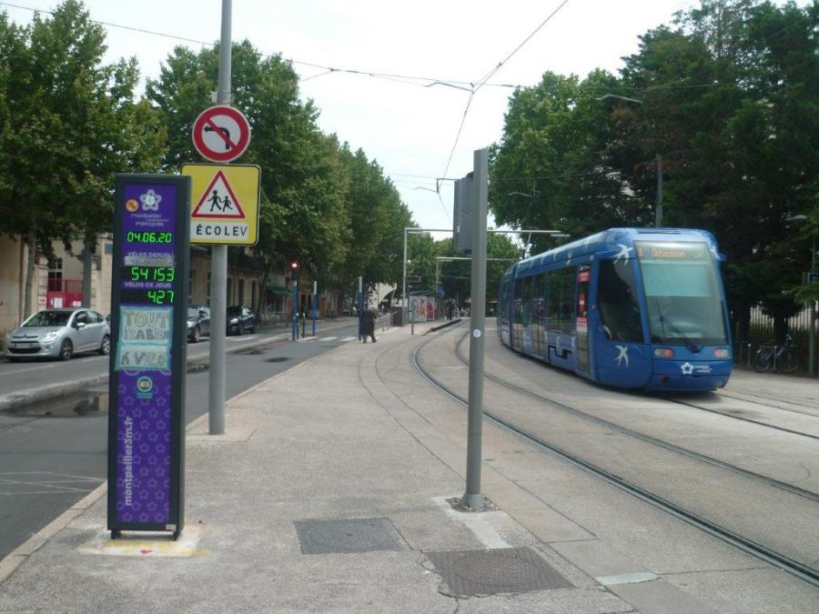 Compteur vélo opérationnel depuis le jeudi 12 mars 2020, avenue Bouisson-Bertrand à Montpellier. Les chiffres indiqués s’appliquent aux deux sens confondus de la piste cyclable. Photo prise le jeudi 4 juin 2020 à 14h05. Copyright : Edouard Paris
