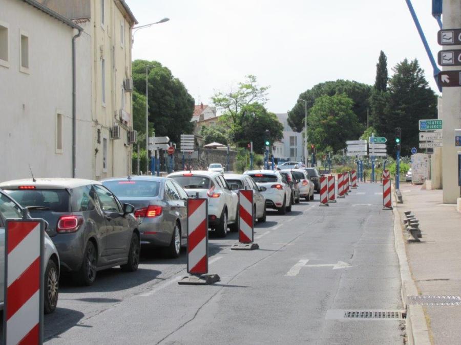 Rue Auguste-Broussonet à Montpellier à la hauteur du stade Philippidès, dans le prolongement de la rue Croix-Catelan, aperçu de la voie cyclable expérimentale temporaire aménagée sur la voie de droite délimitée seulement par des balises de signalisation de chantier en l’absence d’un marquage au sol. Photo prise le mercredi 3 juin 2020 à 16h09. La fluidité de la circulation routière a été grandement impactée à cet endroit. Copyright : Edouard Paris