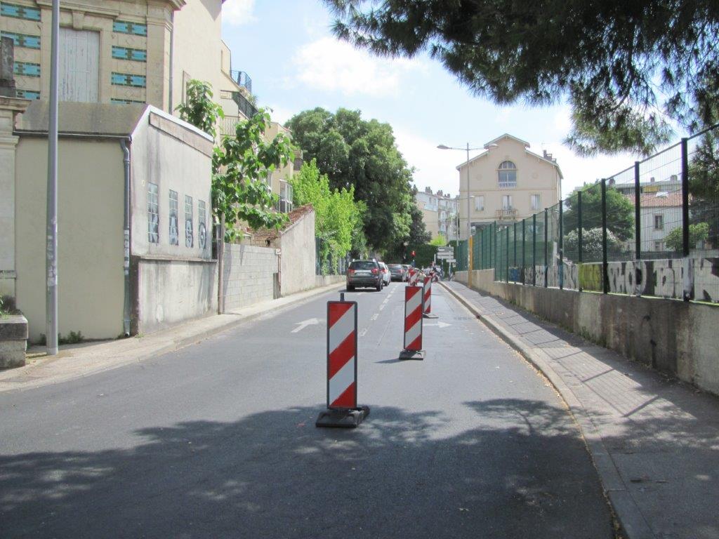 Rue Croix-Catelan à Montpellier, dans le prolongement de l’avenue Saint-Charles, aperçu de la voie cyclable expérimentale temporaire aménagée sur la voie de droite délimitée seulement par des balises de signalisation de chantier en l’absence d’un marquage au sol. Photo prise le mercredi 3 juin 2020. Copyright : Edouard Paris