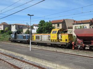 - Un train de contrôle technique, composé du locotracteur 9079, du wagon de contrôle des ouvrages d’art, du wagon ventilateur n°6 (non visible sur la photo) et de la BB 69275 (non visible sur la photo), est photographié au moment où il manœuvre à la hauteur du passage à niveau de l’avenue de la République, à la sortie nord-est de la gare de Millau, le mercredi 20 mai 2020. Copyright : Michel Bozzola