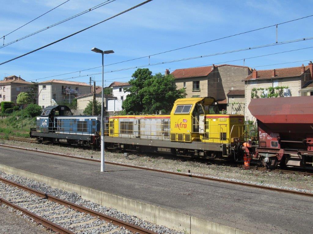 En gare de Millau, photographie des BB 69191 et 69238 en tête d’un convoi composé de wagons de transport du ballast, le jeudi 7 mai 2020, 52e jour de confinement quasi total pour cause de pandémie de coronavirus Covid-19. Copyright : Michel Bozzola