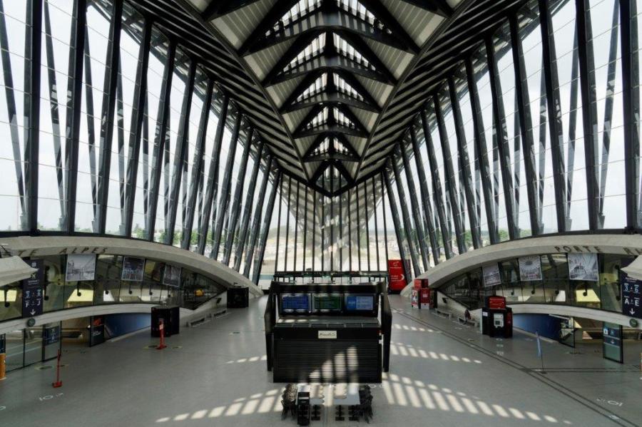 Photographie du hall voyageurs quasi désert de la gare de Lyon – Saint Exupéry, le jeudi 11 juin 2020, 10e jour de la phase 2 de déconfinement progressif en lien avec la pandémie de coronavirus Covid-19. Copyright : Yvon Brument