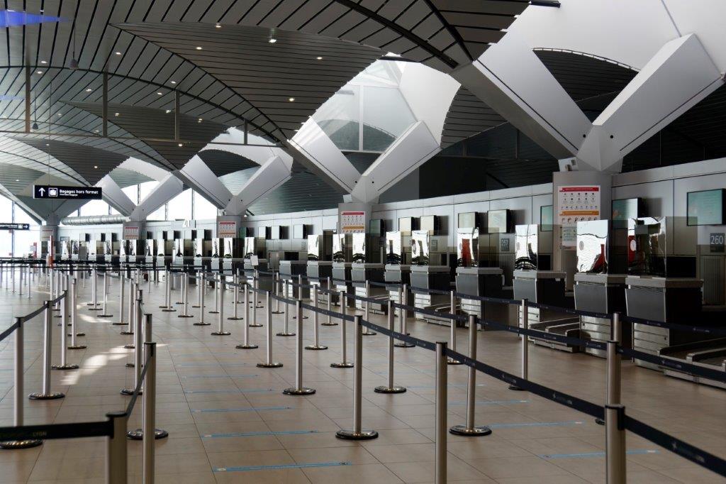 Autres comptoirs d’enregistrement équipés d’écrans de protection en plexiglass situés dans le terminal 2 de l’aéroport Lyon – Saint Exupéry. Photo prise le jeudi 11 juin 2020, 10e jour de la phase 2 de déconfinement progressif en lien avec la pandémie de coronavirus Covid-19. Copyright : Yvon Brument