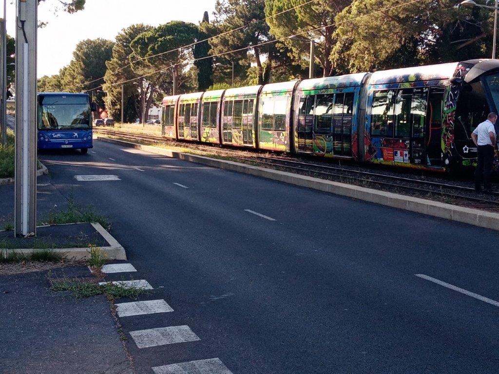 A Lattes, le samedi 20 juin 2020 à 18h44, avenue Georges-Frêche, le long de la ligne 3 de tramway où deux rames sont arrêtées en pleine voie entre les stations « Boirargues » et « Pablo Picasso », un bus de substitution, en l’occurrence le 023 Citelis Irisbus affecté habituellement sur la navette « Gare Montpellier Sud de France », circule en direction du terminus « Pérols – Etang de l’Or ». Copyright : Miguel