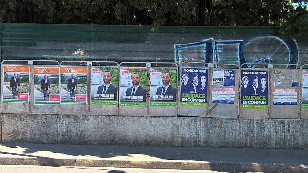 Affiches des trois candidats en lice pour le second tour des élections municipales de Montpellier fixé au dimanche 28 juin 2020. Photographie prise sur l’avenue Saint-Clément à Montpellier, le mercredi 24 juin 2020. Copyright : Edouard Paris