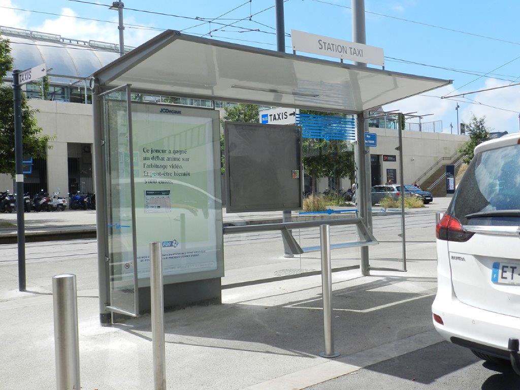 Abri dédié à la nouvelle station de taxis de la gare de Montpellier Saint-Roch, rue Jules-Ferry, en face le parvis Pierre-Brossolette. Photo prise le samedi 27 juin 2020. Copyright : Anje34