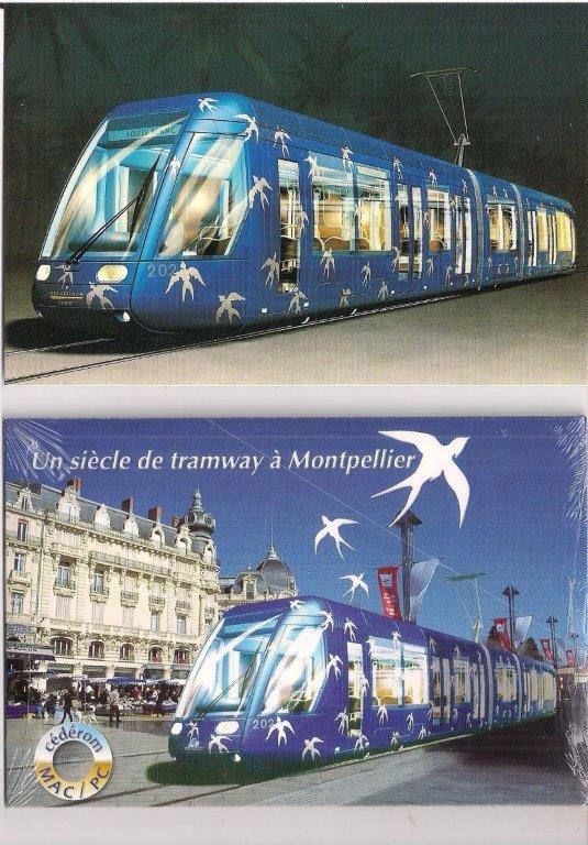 En haut, carte postale éditée au début du mois de février 1998 présentant le design retenu pour les rames Citadis 301 Alstom commandées pour la ligne 1 de tramway moderne de Montpellier. En dessous, photo de la pochette d’un CD-ROM remis à chaque invité à l’inauguration de la ligne 1 de tramway moderne de Montpellier, le vendredi 30 juin 2000. Collection Michel Bozzola