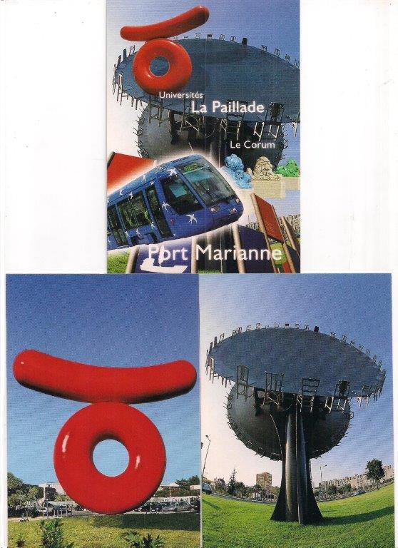 Echantillon de cartes postales éditées au mois de mai 2001 sur le thème des artistes ayant oeuvré pour la ligne 1 de tramway de Montpellier inaugurée le vendredi 30 juin 2000. Collection Michel Bozzola