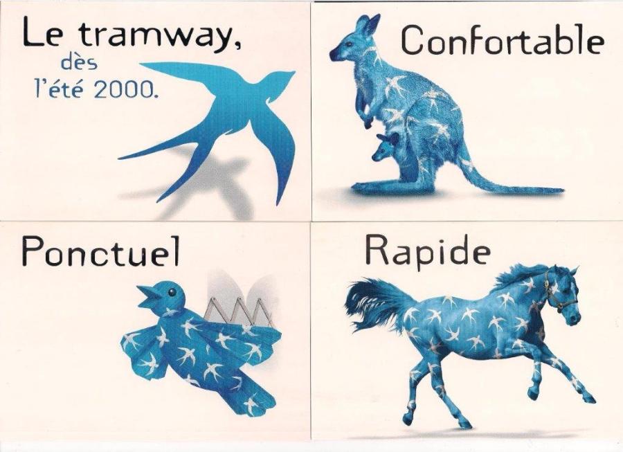 Echantillon de cartes postales éditées dans le cadre de l’inauguration de la ligne 1 de tramway moderne de Montpellier célébrée le vendredi 30 juin 2000. Collection Michel Bozzola